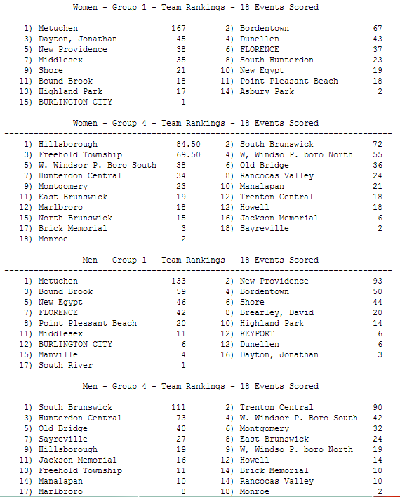 NJSIAA Sectionals - Central - Groups 1 & 4 Robert Kellert May 26, 2013 NJSIAA Sectionals - Central - Groups 1 & 4 Meet Results Team Standings Girls Highlights 100 Meter Hurdles - Patrycja Dziekonska (West Windsor-Plainsboro North HS) 14.36; Drew Bristol-Andrews (Florence Twp HS) 14.79; Paige Brown (West Windsor Plainsboro South HS) 14.48 SB; Khabira Crawford (Dunellen HS) 14.80; Aspen Mcmillan (South Brunswick HS) 14.58; Khabira Crawford (Dunellen HS) 14.76 SB; Patrycja Dziekonska (West Windsor-Plainsboro North HS) 14.76;Drew Bristol-Andrews (Florence Twp HS) 14.81; Paige Brown (West Windsor Plainsboro South HS) 14.89; 1,600 Meter Run - Simone Counts (West Windsor-Plainsboro North HS) 5:06.82 SB; Ciara Roche (Freehold Twp HS) 5:07.06;Deirdre Casey (West Windsor Plainsboro South HS) 5:07.40; Rachel Belmont (Old Bridge HS) 5:10.50; Kelly Janokowicz (Hillsborough HS) 5:11.31; Hope Beyer (Brick Memorial HS) 5:14.01; 3,200 Meter Run - Erika Kemp (Rancocas Valley Reg HS) 10:52.95 SB; Kelly Janokowicz (Hillsborough HS) 11:03.34 SB; Ciara Roche (Freehold Twp HS) 11:05.67 SB; Rachel Belmont (Old Bridge HS) 11:07.40; Stephanie Mauer (Hillsborough HS) 11:13.10;Deirdre Casey (West Windsor Plainsboro South HS) 11:19.14 SB; 400 Meter Dash - Mary Grace Monahan (Manalapan HS) 57.88; 4x800 Meter Relay - Freehold Twp HS 9:33.23; Rancocas Valley Reg HS 9:44.14; West Windsor Plainsboro South HS 9:44.57; 800 Meter Run - Mary Grace Monahan (Manalapan HS) 2:17.85 SB; Emily Bracher (Freehold Twp HS) 2:18.18; Caitlyn Poss(Freehold Twp HS) 2:19.62; Discus - Danielle Padovano (South Brunswick HS) 123-10 SB; High Jump - Paige Brown (West Windsor Plainsboro South HS) 5-4 SB; Javelin - Kelly Yanucil (Bordentown Reg. HS) 131-1; Melody Walthers (Howell HS) 131-4 SB; Kelsey McDonald (East Brunswick HS) 129-8 SB; Kristin Krier (South Brunswick HS) 127-6 SB; Long Jump - Patrycja Dziekonska (West Windsor-Plainsboro North HS) 17-10.75 SB; Rachel Huang (East Brunswick HS) 17-9; Pole Vault - Marlena Sabatino (Hillsborough HS) 11-0; Triple Jump - Deanna Johnson (Freehold Twp HS) 39-4.5 SB; Kelsey Vieira (Hillsborough HS) 37-9.25 SB; Patrycja Dziekonska(West Windsor-Plainsboro North HS) 37-5.5 SB; Paige Brown (West Windsor Plainsboro South HS) 36-11.25 SB; Amber Edwards(Sayreville HS) 36-11; Nenna Ibe (North Brunswick HS) 36-0.75 SB; Boys Highlights 100 Meter Dash - Zyaire Clemes (Trenton Central HS) 10.68 SB; 110 Meter Hurdles - Hakim Horton (Trenton Central HS) 14.30 SB; Hakim Horton (Trenton Central HS) 14.69; 1,600 Meter Run - Dan Riff (West Windsor Plainsboro South HS) 4:24.73; 200 Meter Dash - Zyaire Clemes (Trenton Central HS) 21.70 SB; 3,200 Meter Run - Dan Riff (West Windsor Plainsboro South HS) 9:33.19; Dylan Tarpey (Freehold Twp HS) 9:34.86; Sam Habib (Old Bridge HS) 9:35.37; Taylor Casserly (Old Bridge HS) 9:36.89 SB; Thomas Vinci (West Windsor Plainsboro South HS) 9:37.81; 400 Meter Dash - Zyaire Clemes (Trenton Central HS) 48.61; Ty Jaye Robbins (East Brunswick HS) 49.47; 4x800 Meter Relay - South Brunswick HS 8:06.81; Hunterdon Central HS 8:07.58; 800 Meter Run - Eddison Gulama (West Windsor Plainsboro South HS) 1:57.87; Javelin - Curtis Thompson (Florence Twp HS) 189-2; Pole Vault - Michael Closs (New Providence HS) 14-0; Shot Put - David McGriff (Hunterdon Central HS) 51-10.75; Triple Jump - Jon Pitt (South Brunswick HS) 49-5 SB; Christian Larbie (South Brunswick HS) 47-6.25 SB; Hakim Horton (Trenton Central HS) 46-11.75 SB; Myles Hartsfield (Sayreville HS) 45-10; @njrunners movin on #400hurdles twitter.com/AyeM0/status/3… — Ally Mo (@AyeM0) May 25, 2013